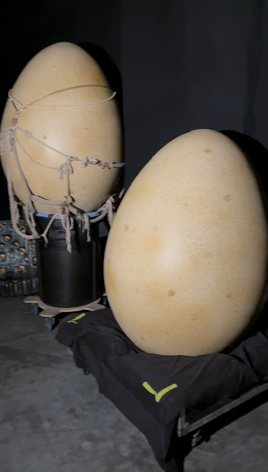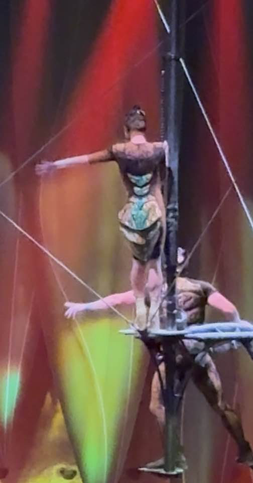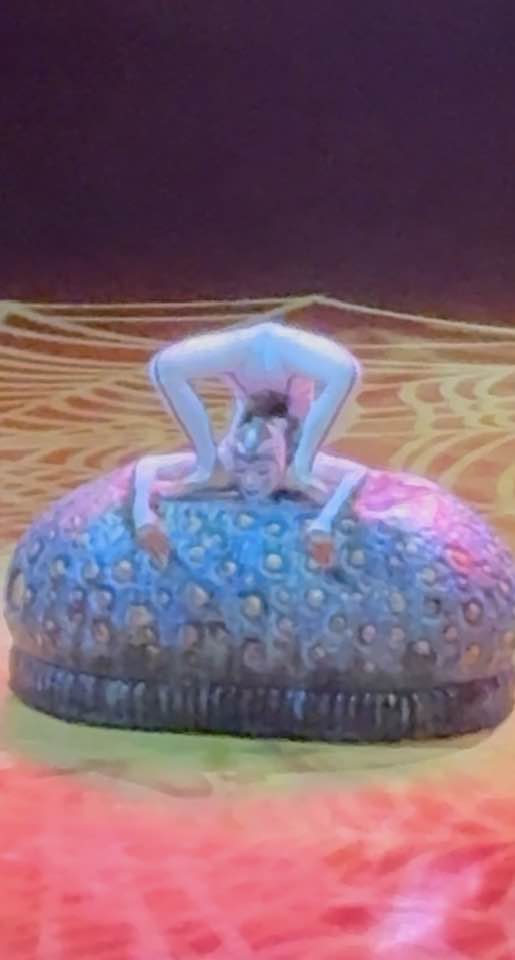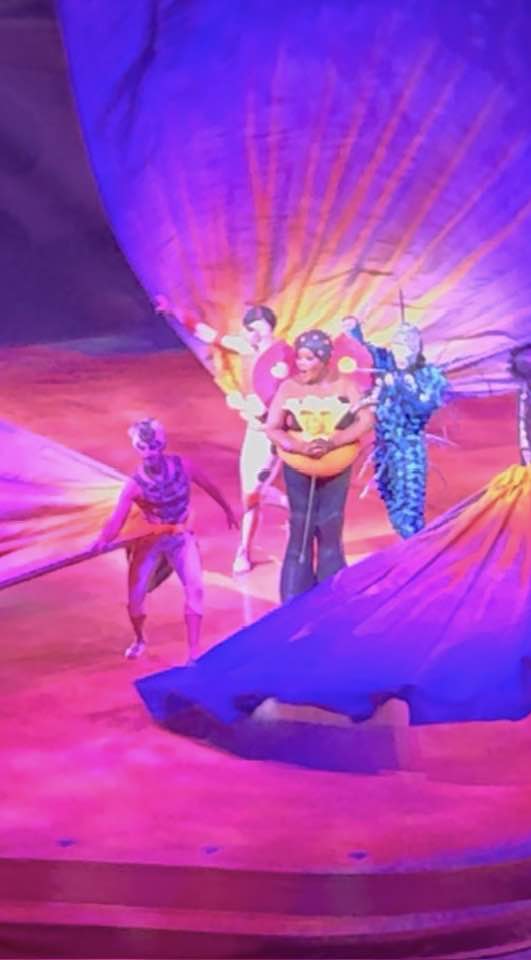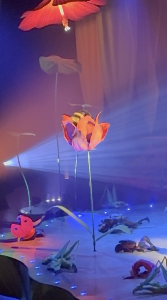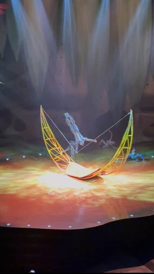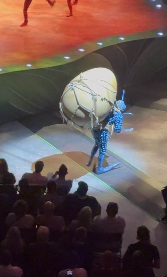 For those wondering, Ovo is Portugese for egg, so this story is about an insect who’s carrying an egg, and stumbles upon other insects, and they show him their lives. These are some of the acts: ants are foot-juggling, a dragonfly is hand balancing, soon-to-be butterfly is doing aerial silks, butterflies do duo straps, a firefly does Diabolos, the Creatura that does the giant suit below (looks like slinkys), scarabs do Russian cradle, a spider does contortion, fleas do Chinese pole, a spider does slackwire, crickets do trampoline and tumble track. There is non-stop movement throughout the entire show, and funny skits as well! Here are some of the things we saw, behind the stage, and then during the show: